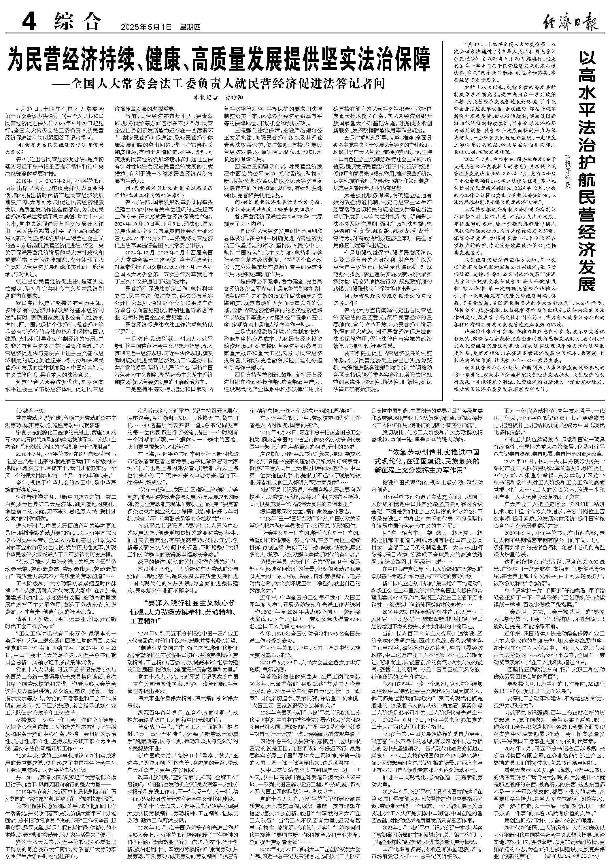 4月30日,十四届全国人大常委会第十五次会议表决通过了《中华人民共和国民营经济促进法》,自2025年5月20日起施行。这是我国第一部专门关于民营经济发展的基础性法律,事关“两个毫不动摇”的坚持和落实,事关经济高质量发展。