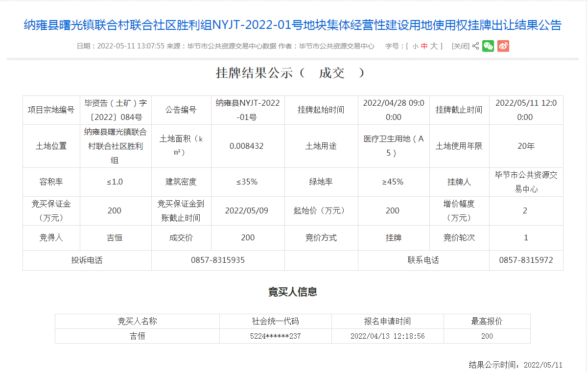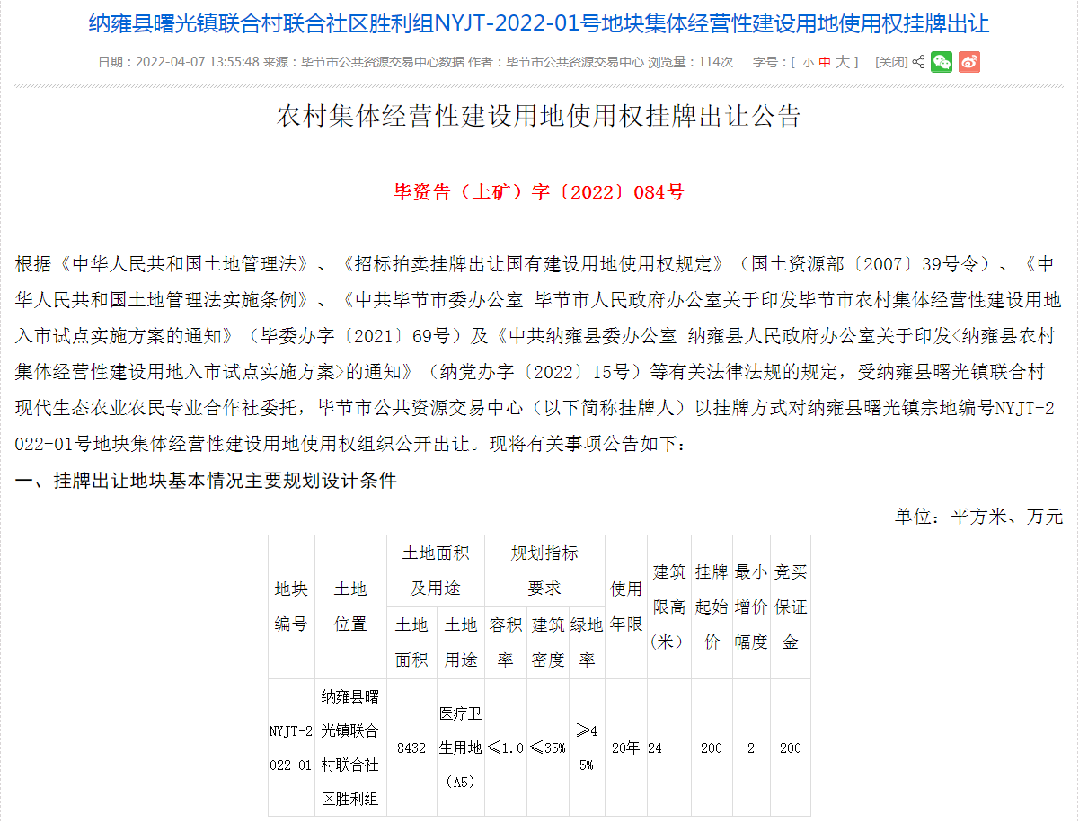 毕节市首宗入市的农村集体经营性建设用地位于纳雍县曙光镇联合村联合社区胜利组,出让面积约8432平方米,出让年限20年,起始价总价为200万元,保证金为200万元,增价幅度为2万元。