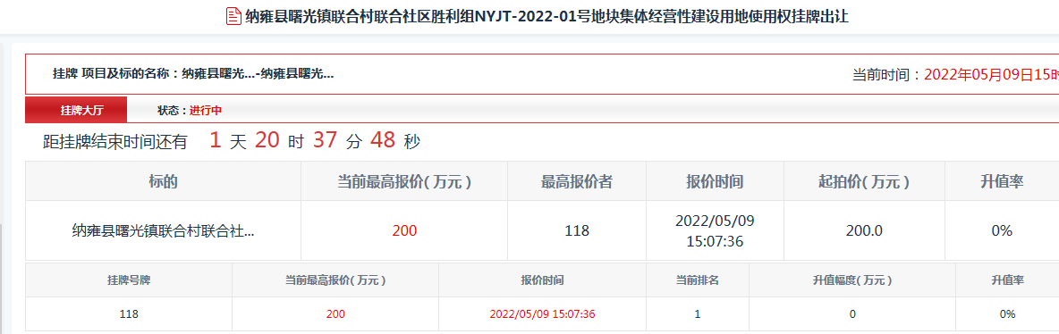 毕节市首宗入市的农村集体经营性建设用地位于纳雍县曙光镇联合村联合社区胜利组,出让面积约8432平方米,出让年限20年,起始价总价为200万元,保证金为200万元,增价幅度为2万元。