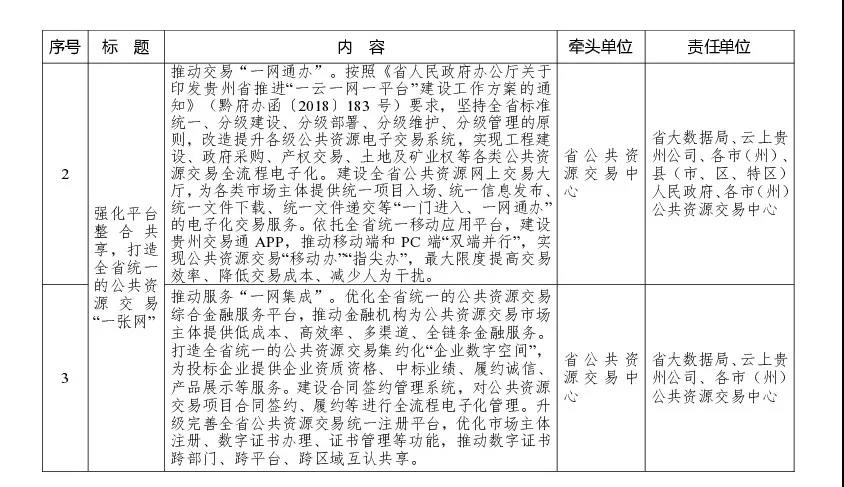 2.推动交易“一网通办”。按照《省人民政府办公厅关于印发贵州省推进“一云一网一平台”建设工作方案的通知》(黔府办函〔2018〕183号)要求,坚持全省标准统一、分级建设、分级部署、分级维护、分级管理的原则,改造提升各级公共资源电子交易系统,实现工程建设、政府采购、产权交易、土地及矿业权等各类公共资源交易全流程电子化。建设全省公共资源网上交易大厅,为各类市场主体提供统一项目入场、统一信息发布、统一文件下载、统一文件递交等“一门进入、一网通办”的电子化交易服务。依托全省统一移动应用平台,建设贵州交易通APP,推动移动端和PC端“双端并行”,实现公共资源交易“移动办”“指尖办”,最大限度提高交易效率、降低交易成本、减少人为干扰。