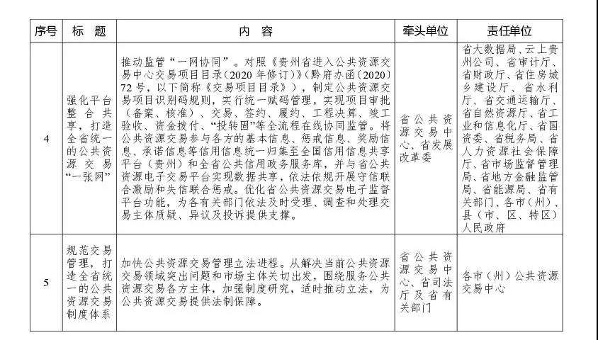 4.推动监管“一网协同”。对照《贵州省进入公共资源交易中心交易项目目录(2020年修订)》(以下简称《交易项目目录》),制定公共资源交易项目识别码规则,实行统一赋码管理,实现项目审批(备案、核准)、交易、签约、履约、工程决算、竣工验收、资金拨付、“投转固”等全流程在线协同监管。将公共资源交易参与各方的基本信息、惩戒信息、奖励信息、承诺信息等信用信息统一归集至全国信用信息共享平台(贵州)和全省公共信用政务服务库,并与省公共资源电子交易平台实现数据共享,依法依规开展守信联合激励和失信联合惩戒。优化省公共资源交易电子监督平台功能,为各有关部门依法及时受理、调查和处理交易主体质疑、异议及投诉提供支撑。