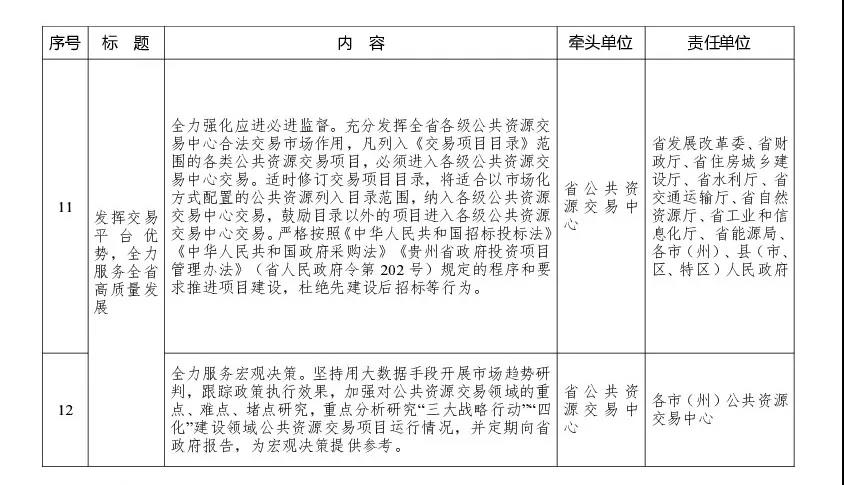 11.全力强化应进必进监督。充分发挥全省各级公共资源交易中心合法交易市场作用,凡列入《交易项目目录》范围的各类公共资源交易项目,必须进入各级公共资源交易中心交易。适时修订《交易项目目录》,将适合以市场化方式配置的公共资源列入目录范围,纳入各级公共资源交易中心交易,鼓励目录以外的项目进入各级公共资源交易中心交易。严格按照《中华人民共和国招标投标法》《中华人民共和国政府采购法》《贵州省政府投资项目管理办法》(省政府令第202号)规定的程序和要求推进项目建设,杜绝先建设后招标等行为。
