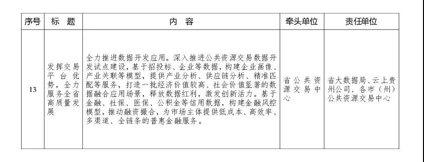 13.全力推进数据开发应用。深入推进公共资源交易数据开发试点建设,基于招投标、企业等数据,构建企业画像、产业关联等模型,提供产业分析、供应链分析、精准匹配等服务,打造一批经济价值较高、社会价值显著的数据融合应用场景,释放“数据红利”,激发创新活力。基于金融、社保、医保、公积金等信用数据,构建金融风控模型,推动融资撮合,为市场主体提供低成本、高效率、多渠道、全链条的普惠金融服务。
