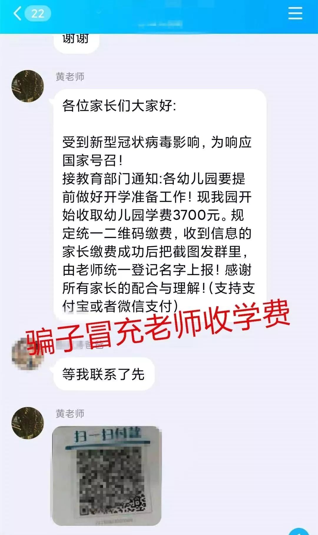 近期,据一些中小学生家长反映,有人通过班级微信群、QQ群等媒介假冒学校教师或班主任身份,以延期开学和组织开展线上教学为由发布诈骗信息,要求学生家长通过微信、支付宝等网上支付方式缴纳各项费用,致使部分家长上当受骗。
