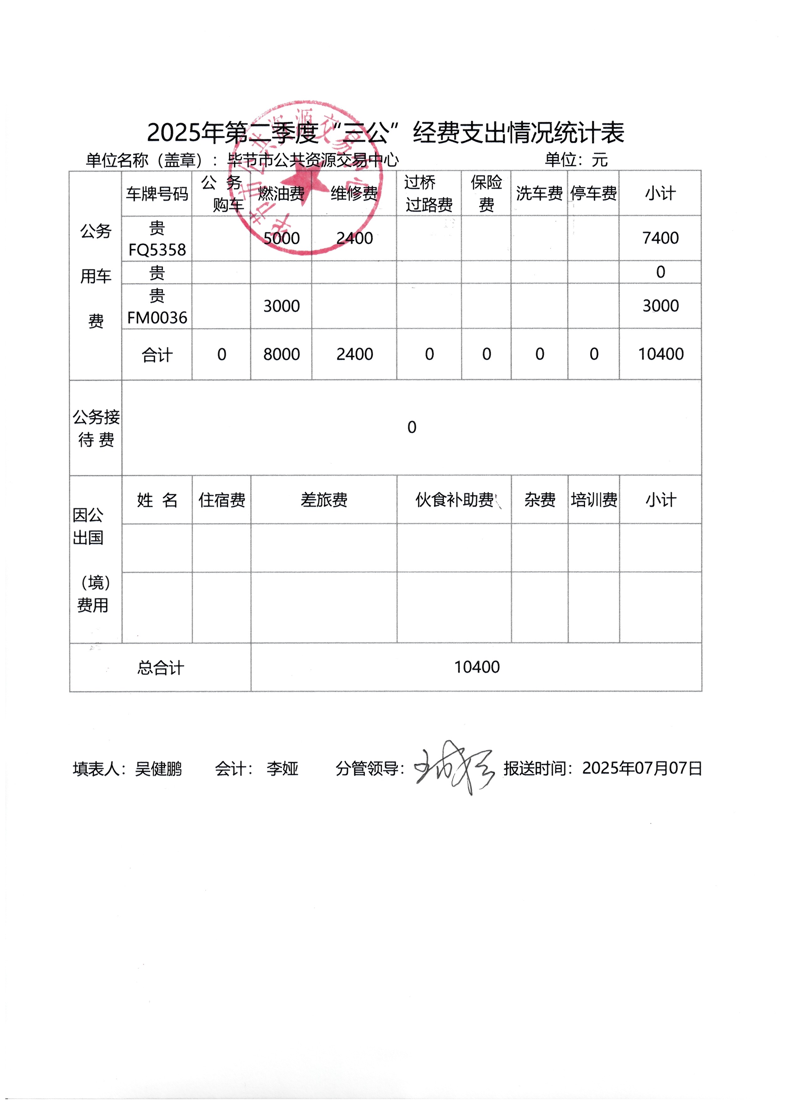 毕节市公共资源交易中心2025年第二季度“三公”经费支出情况表